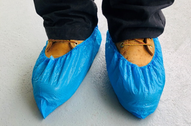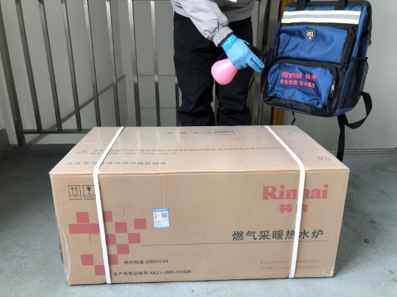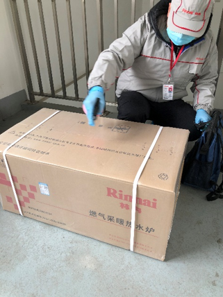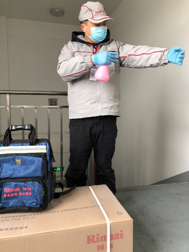 服務(wù)人員在用戶家門口,要對(duì)貨品及施工工具進(jìn)行消毒,穿上鞋套,給自己噴上消毒水。