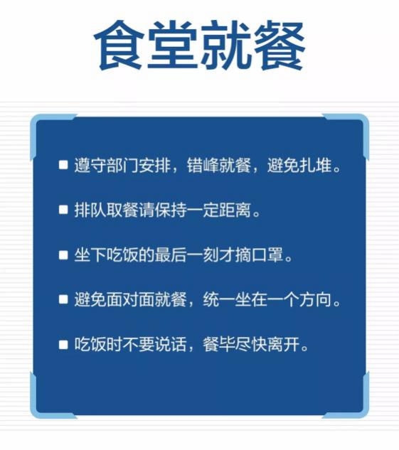 公司對餐廳用餐環(huán)境進(jìn)行了改造,保證必要的安全距離,餐桌使用隔板進(jìn)行隔離,每桌容納4人就餐,并制定了詳細(xì)的就餐動線及就餐衛(wèi)生安全要求,以及各部門的就餐時間和就餐地點等,進(jìn)行分流、分時、分隔的就餐管理。