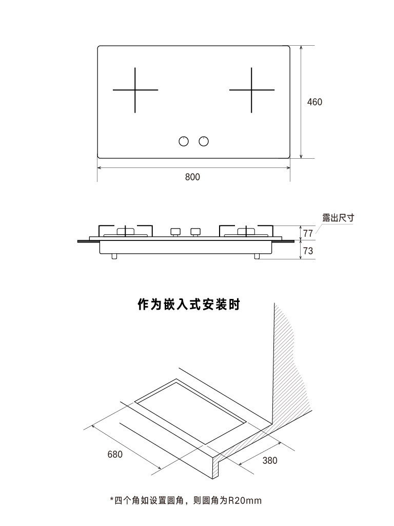 嵌裝開孔尺寸(mm) : (K6)(W)680×(D)380×R20